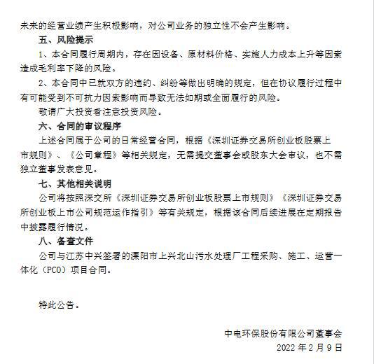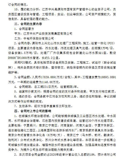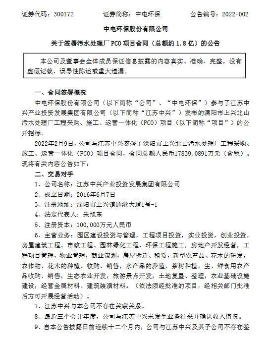 2022年2月9日,公司与江苏中兴签署了溧阳市上兴北山污水处理厂工程采购、施工、运营一体化(PCO)项目合同,合同总额人民币约1.78亿元(含税)。