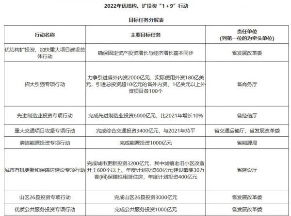 (一)强化部门协同。实施优结构、扩投资“1+9”行动,省发展改革委牵头负责专班运作、统筹协调,省级有关单位各司其职、分工协作,确保全省投资目标任务落实到位。