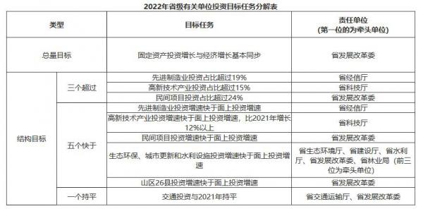 2.优化投资结构。力争2022年先进制造业投资、高新技术产业投资和民间项目投资,占全省投资比重分别超过19%、15%和24%;先进制造业投资,高新技术产业投资,民间项目投资,生态环保、城市更新和水利设施投资,山区26县投资增速快于面上投资增速;交通投资与2021年持平。